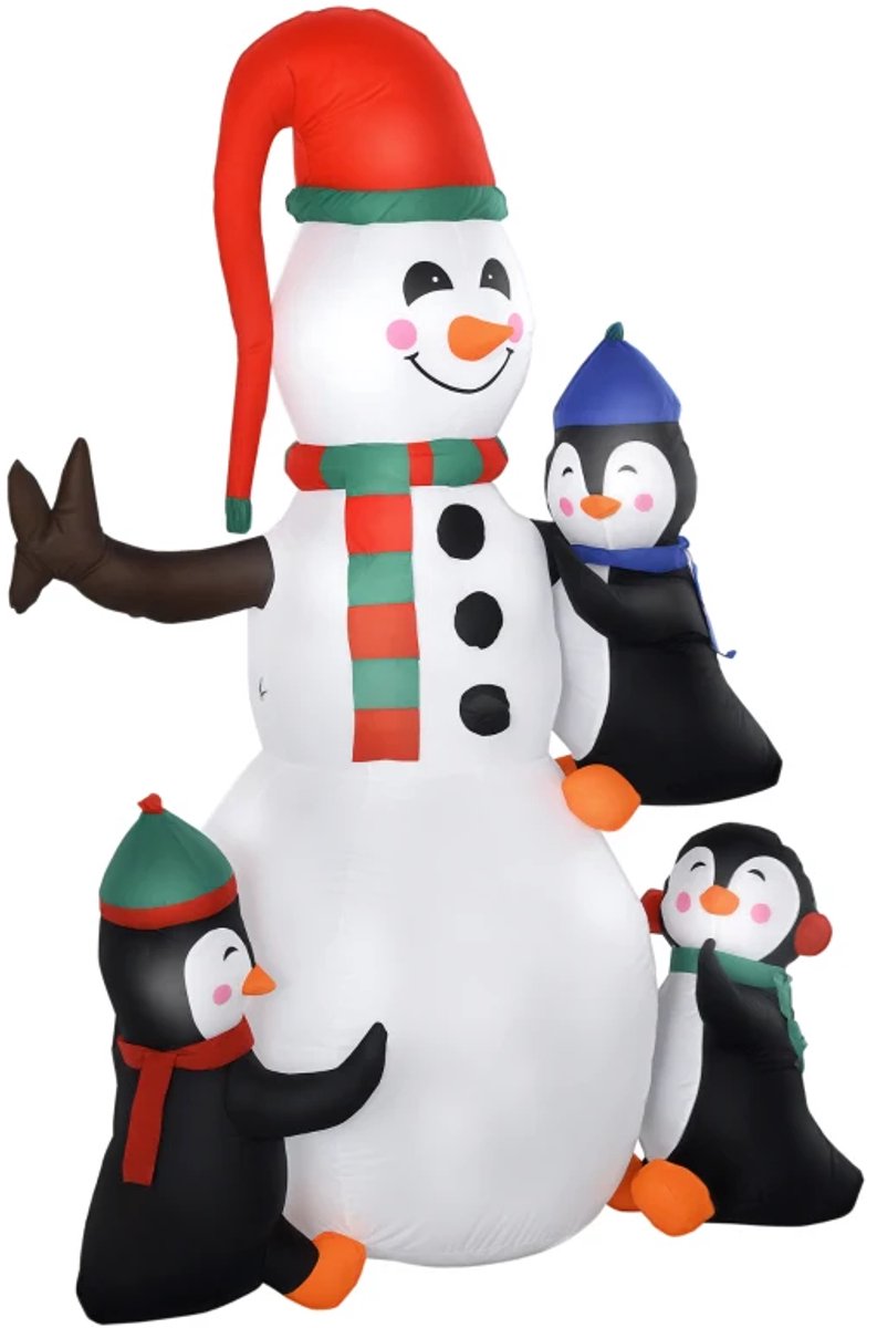 Geweldig kerstplezier: De 1,8 m hoge sneeuwpop met zijn drie kleine pinguïnvriendjes is een opvallende en schattige kerstversiering voor je voortuin of terras.