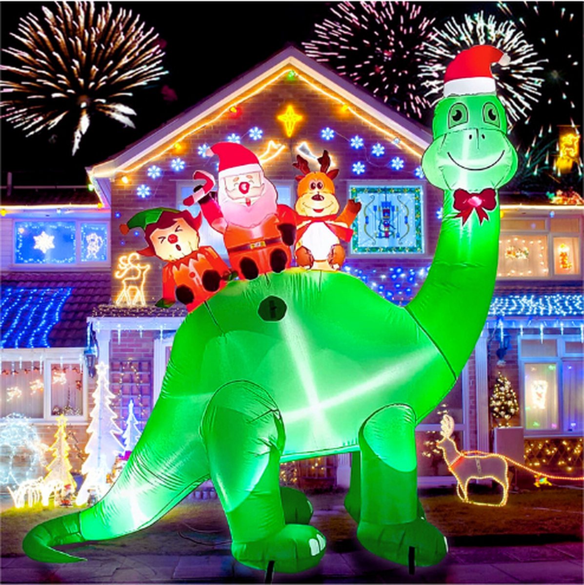 Verhoogt de Feestsfeer: De opblaasbare dinosaurus voegt een speels en vrolijk element toe aan je kerstversiering. Samen met de kerstman, elf, en rendier zorgt het voor een magisch gevoel van feest dat je niet kunt missen.