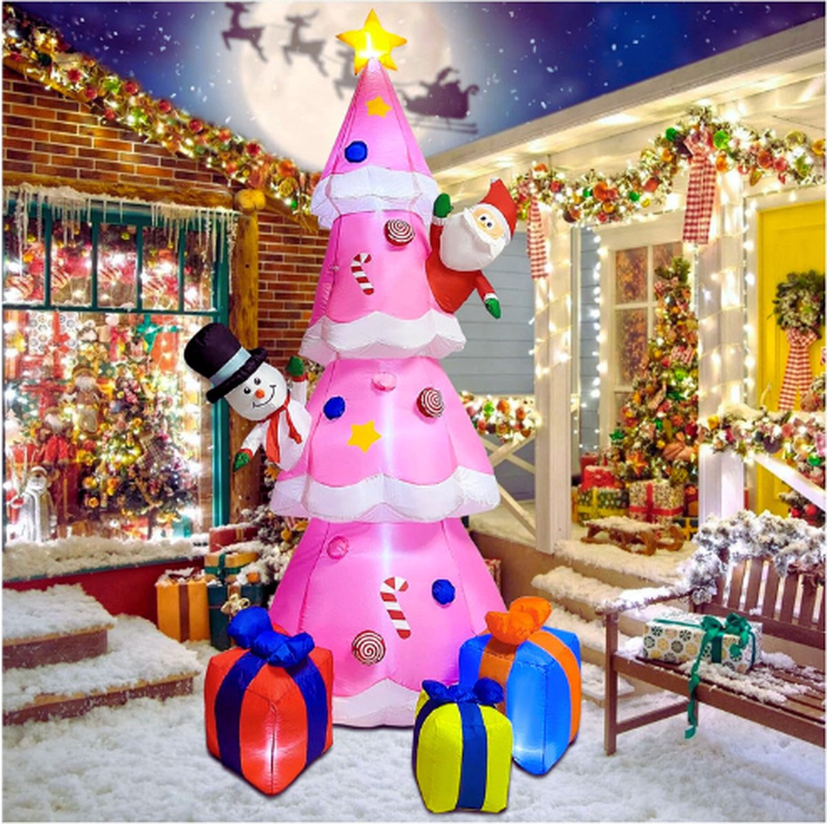 Met de Opblaasbare Roze Kerstboom breng je gegarandeerd een glimlach op het gezicht van je familie, vrienden en gasten. De kerstman en sneeuwpop voegen een speelse en charmante toets toe, terwijl de geschenkdoos onder de boom de gedachte aan het geven tijdens de feestdagen benadrukt. De LED-verlichting maakt deze kerstboom tot een stralend middelpunt in je huis of tuin. Of je nu een groot kerstfeest organiseert of gewoon de kerstsfeer in je huis wilt brengen, deze opblaasbare kerstboom is een fantastische keuze. Maak van deze kerst een magische ervaring met deze vrolijke en unieke opblaasbare kerstversiering!