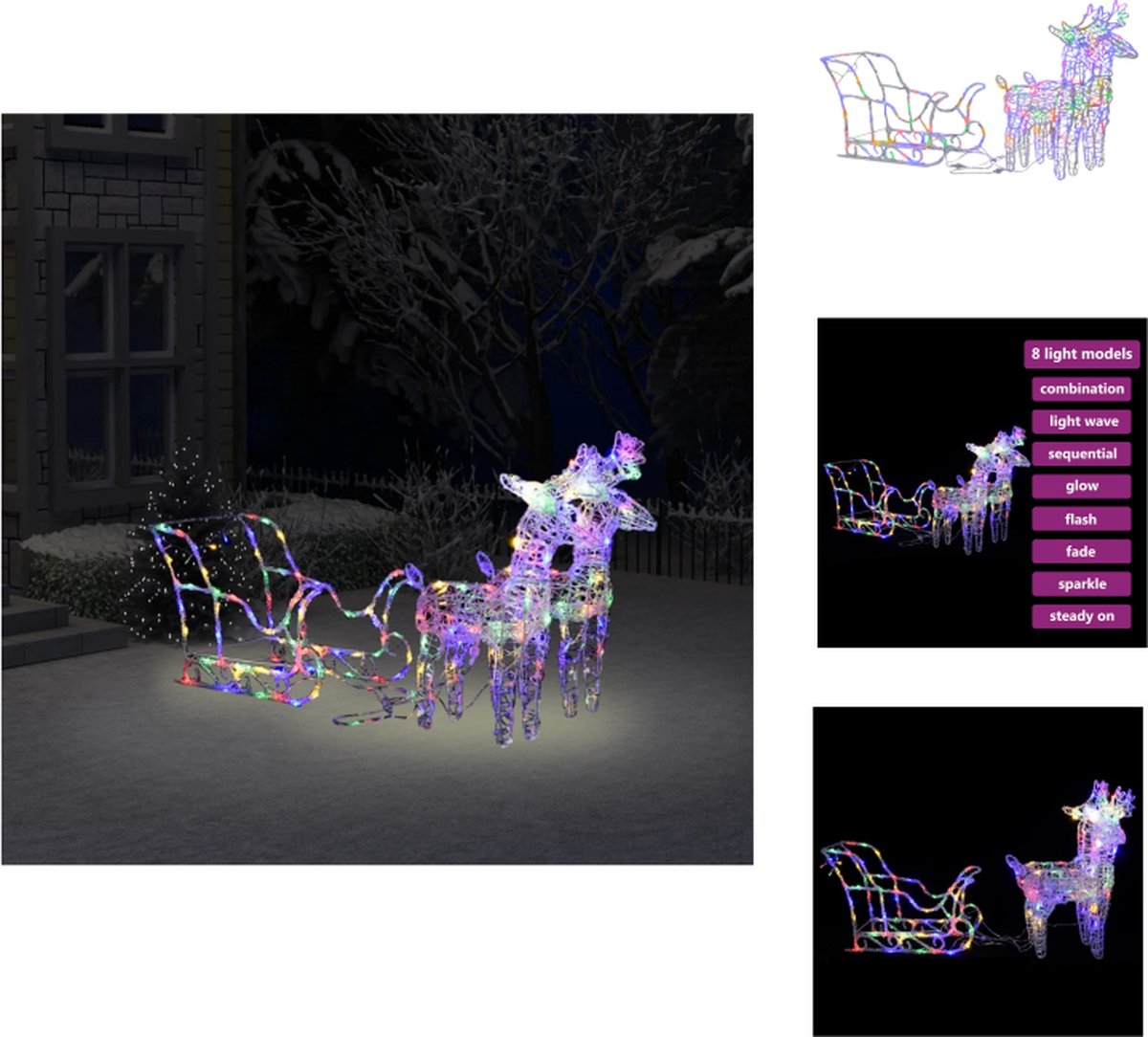 VidaXL Kerstversiering rendieren en slee 160 LED’s 130 cm acryl Verfraai je tuin of huis met deze unieke versiering. Deze 2 rendieren en slee brengen in combinatie met kleurrijke lampjes de ware kerstsfeer naar voren!