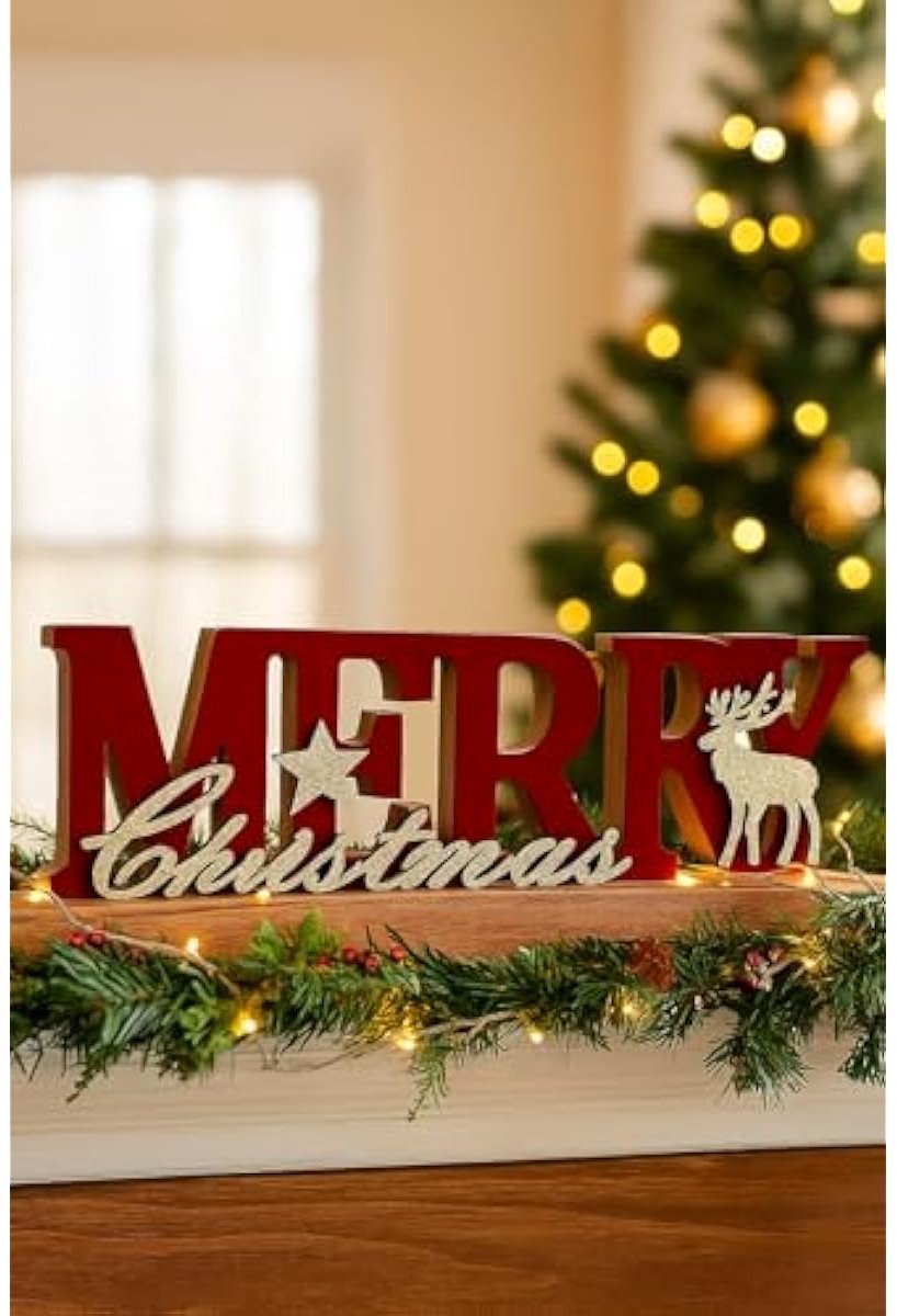 Het decoratieve opschrift bestaat uit MDF-hout en combineert het krachtige rode “Merry” met een stijlvol gouden “Christmas”-opschrift – direct daarvoor