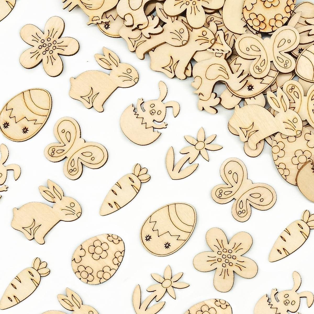 100 Stuks Paasdecoratie voor Tafel – Konijnen, Eieren, Bloemen – Houten Paasdecoratie