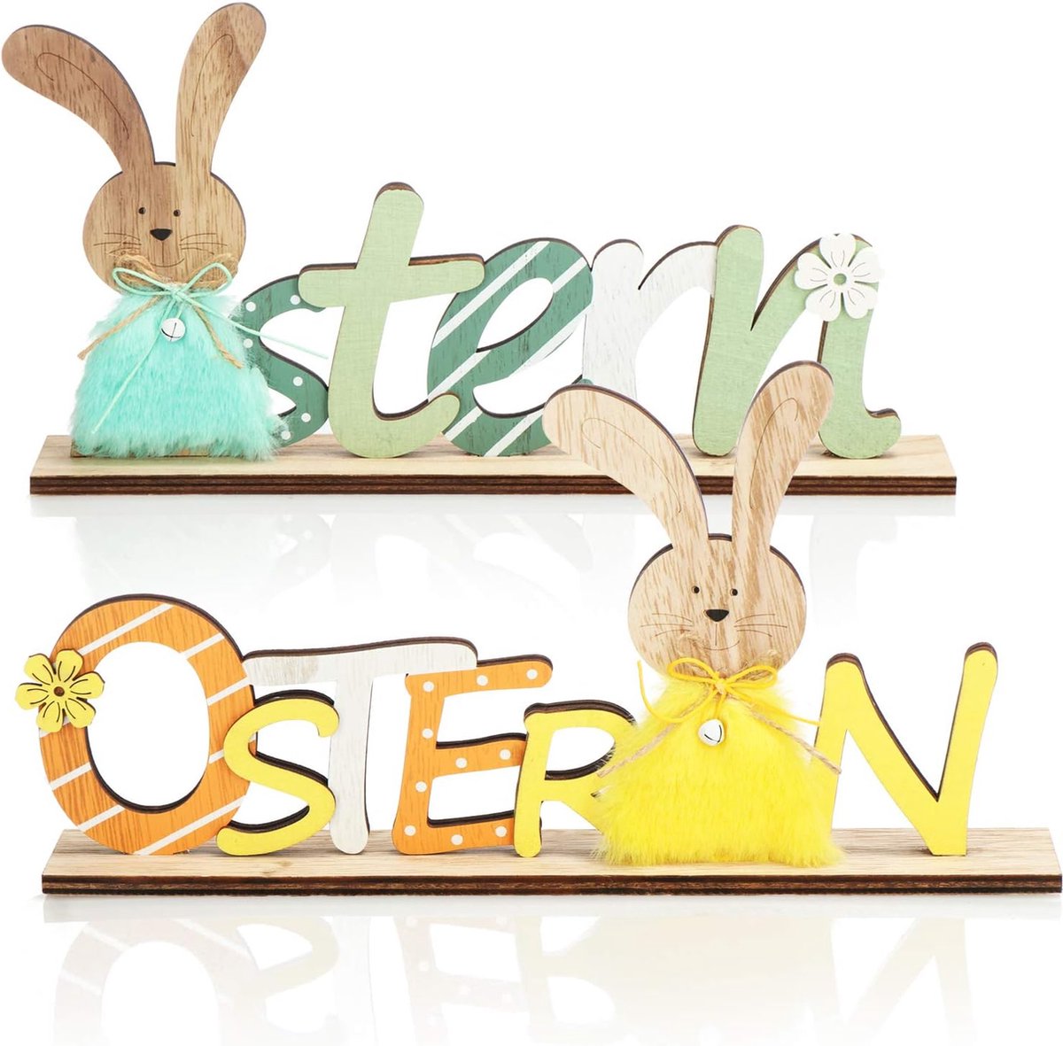 2 x decoratieve staander voor Pasen – opschrift met paashaas – paasdecoratie om neer te zetten – paasdecoratie van hout (02 stuks – turquoise/geel)