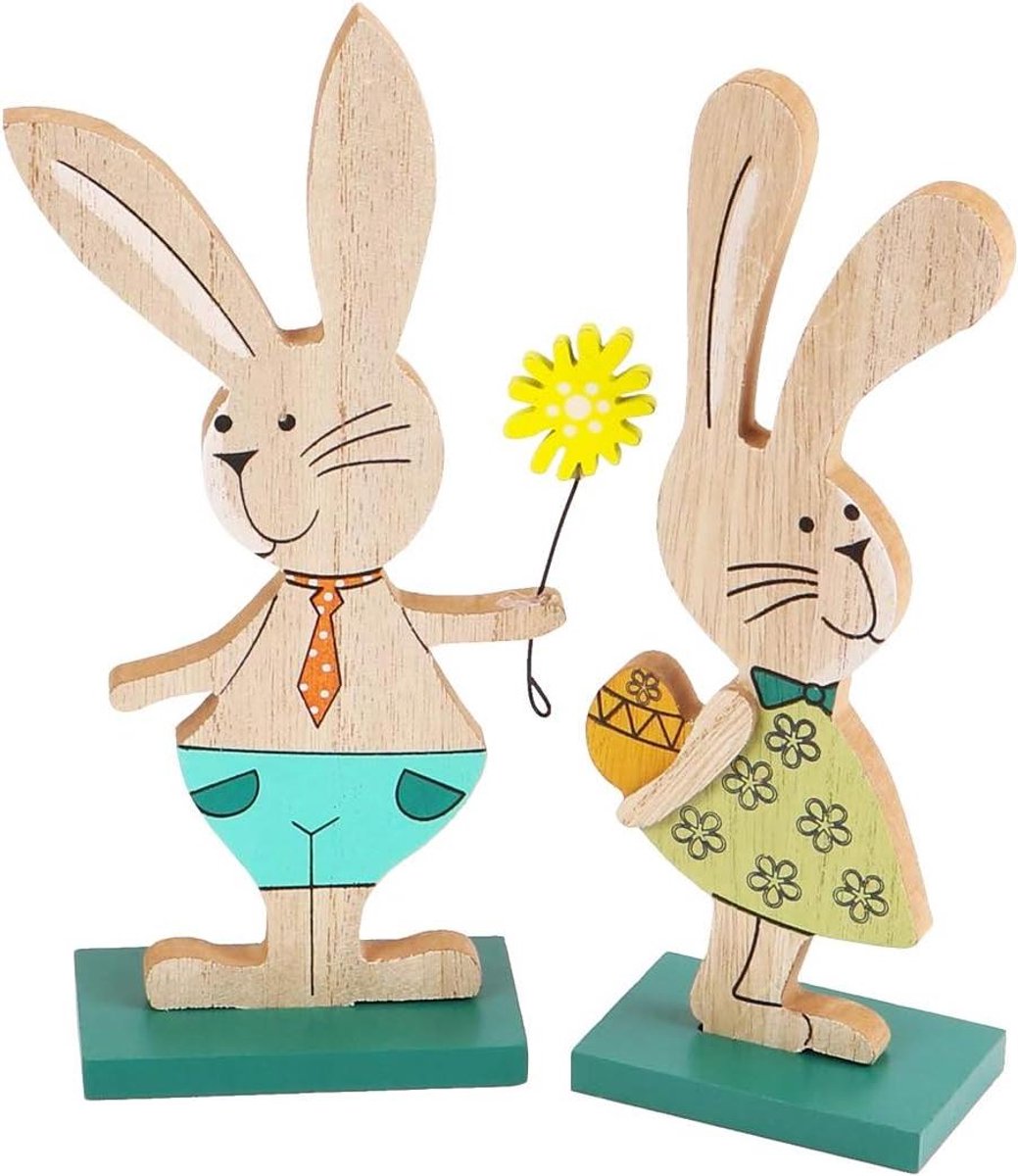 “`html Houten paasdecoratie: de productset bestaat uit 1 groene konijn met bloemen en 1 gele konijn met eieren, die je op verschillende plaatsen in je huis kunt plaatsen.