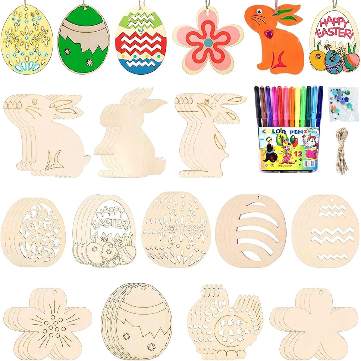 Eenvoudig in Gebruik: Elke houten paasversiering is voorzien van een klein gaatje, waardoor je ze gemakkelijk kunt ophangen aan de bijgeleverde touw. Kinderen kunnen hun creativiteit de vrije loop laten door te schrijven, tekenen en knutselen op de houten decoraties.