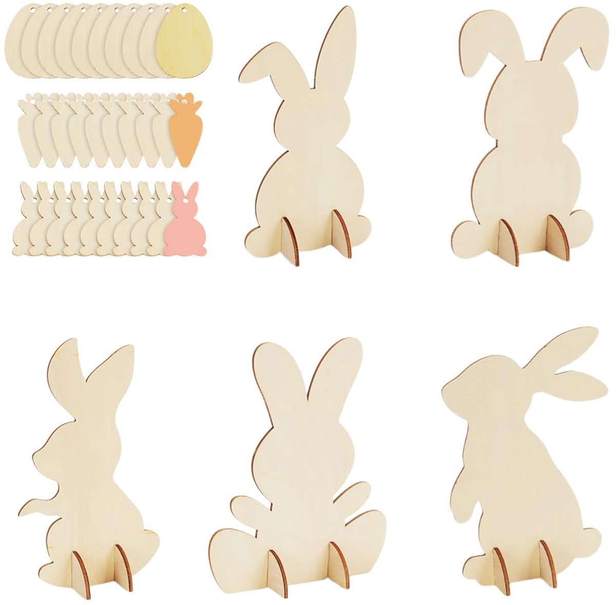 TRANKIELO® – Houten Paasdecoraties – 5 Stuks 3D Konijn, Eieren en Wortels – Onvoltooid Hout voor DIY Knutselprojecten