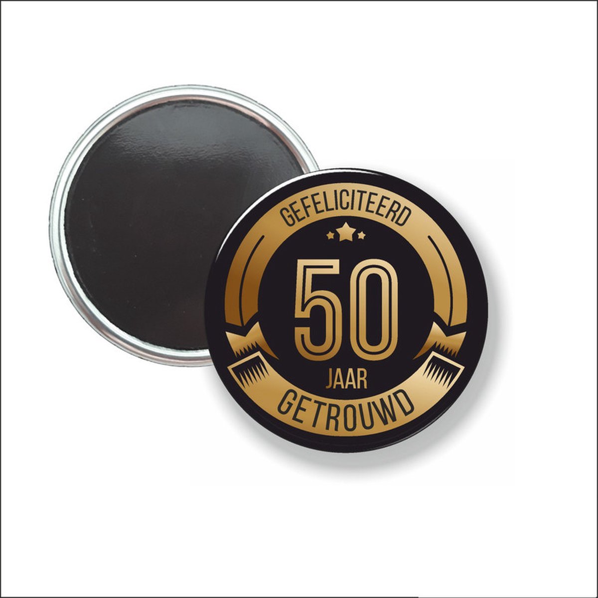 Button Met Magneet 58 MM – Gefeliciteerd 50 Jaar Getrouwd – NIET VOOR KLEDING
