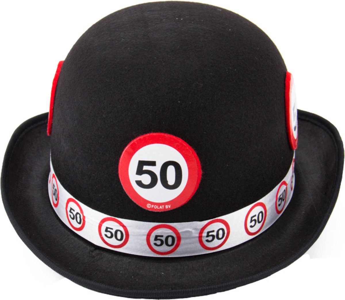 50 Jaar verkeersbord Zwarte Bolhoed. Inhoud: 1 hoed, kleur: Zwart. Deze hoed is perfect voor verjaardag of themafeest. Deze hoed is 20,5 cm breed en 11 cm hoog. Het artikel is gemaakt van polyester.