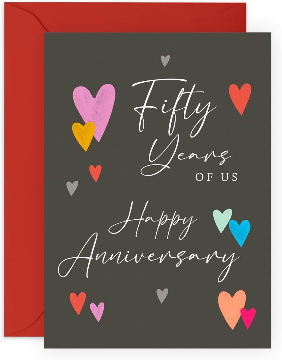 Vier een mijlpaal met deze prachtige 50e huwelijksjubileumkaart. De kaart, met de tekst ‘Fifty Years Of Us’, is het perfecte geschenk om te geven aan uw vrouw, echtgenoot, ouders, mama of papa ter gelegenheid van hun gouden feest. De set wordt geleverd met leuke, bijpassende stickers om de kaart extra feestelijk te maken. Een tijdloze herinnering aan een halve eeuw liefde.