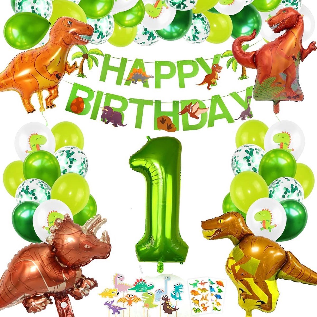 Verjaardagsset dino 1 jaar – Feestartikelen dino 1 jaar – Verjaardag decoratie dino thema – Dino verjaardagsversiering voor jongens en meisjes – Dino ballonnen voor 1e verjaardag – Dino taartdecoratie – Dinosaurus feestartikelen voor 1-jarigen