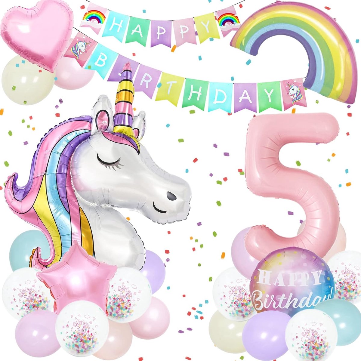 Unicorn Verjaardagsdecoratieset – 3D Unicorn Ballonnen – Massive Folie Ballon – Macaroon 5 – Unicorn Folie Ballon Set met Gelukkige Verjaardag Banner – Regenboog Wolk Ballonnen voor Meisjes – Verjaardagsfeest