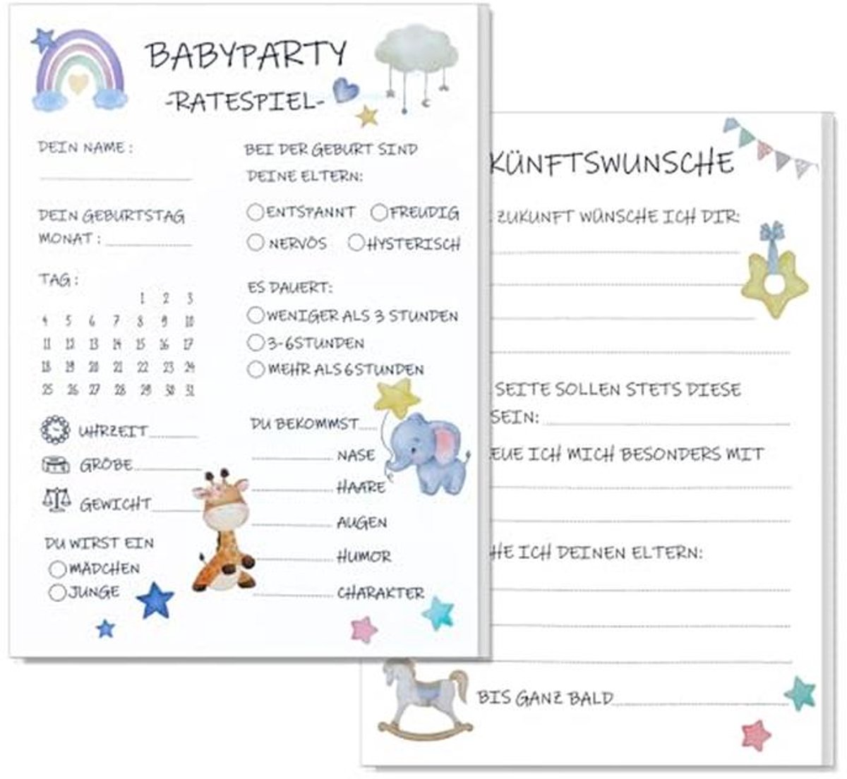 Deze set van 25 babyshower raadspel kaarten is perfect voor jouw babyshower of gender reveal party. De kaarten zijn dubbelzijdig bedrukt en bieden een leuke manier om gasten te vermaken. Een ideaal spel om samen herinneringen te creëren!