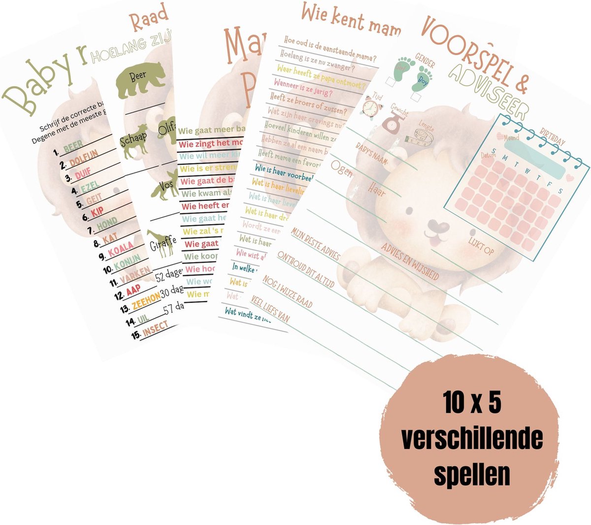 Babyshower – Babyshower spellen – Baby – Zwangerschap – Set voor 10 personen – A5 – Leeuw – Eigen design en print