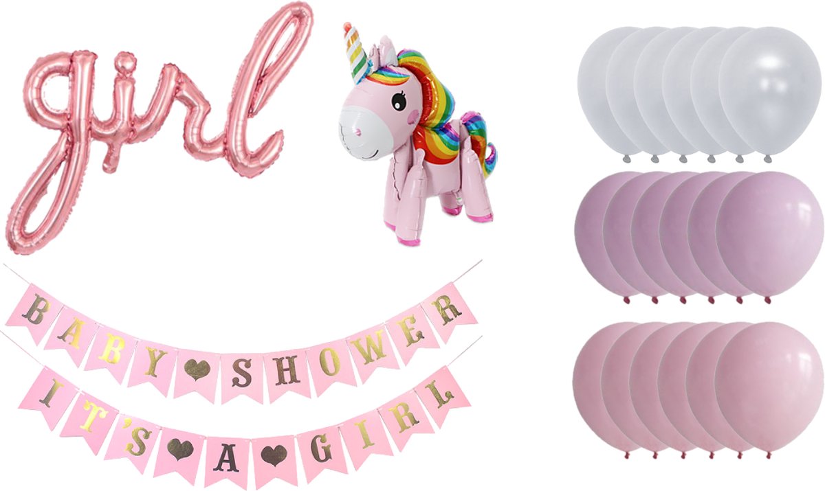 Deze unicorn decoratieset is ideaal voor een babyshower als er een meisje geboren is. Deze unicorn decoratieset bevat alles wat je nodig hebt om de babyshower tot een succes te maken! De unicorn set is compleet met een grote Girl ballon, ballonnen in verschillende kleuren, een grote unicorn ballon en twee vlaggen met ‘babyshower’ en ‘it’s a girl’ erop!