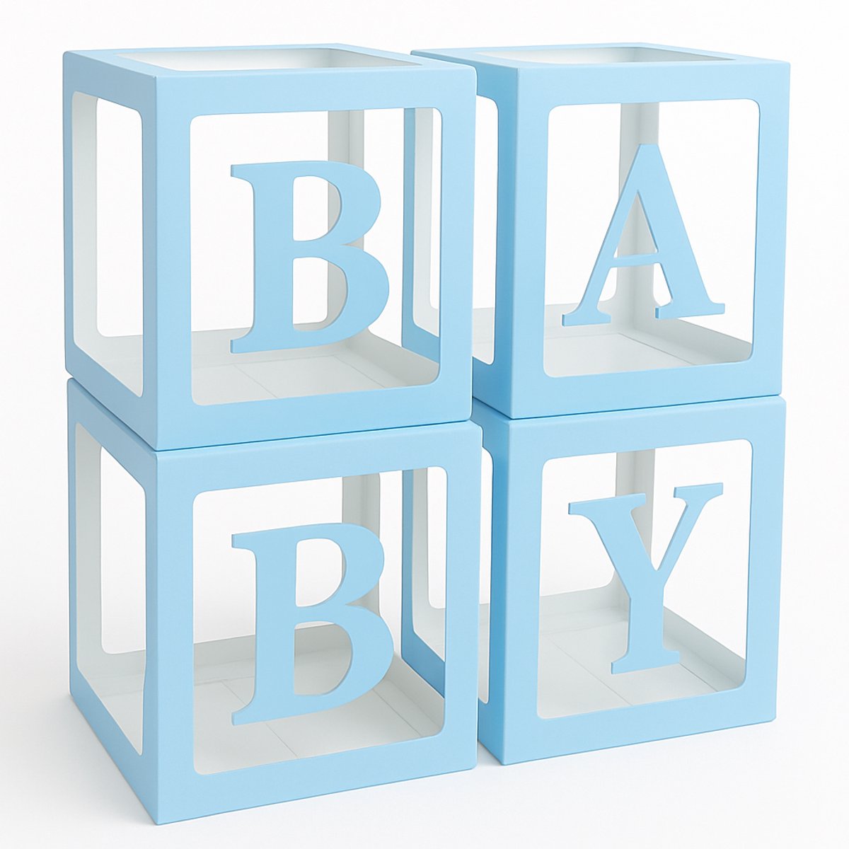 Maak van elke babyshower een onvergetelijk moment met deze luxe ballondozen Deze stijlvolle ballondozen zijn dé perfecte decoratie voor elke babyshower. Met hun elegante witte frame, transparante zijden en de bijgeleverde BABY-letters vorm je eenvoudig een opvallende blikvanger. Het pakket bestaat uit vier grote dozen van 30 x 30 x 30 cm, die je naar wens kunt vullen met ballonnen, bloemen of andere feestartikelen. Of het nu een jongen of meisje wordt, deze decoratie past bij elk thema.