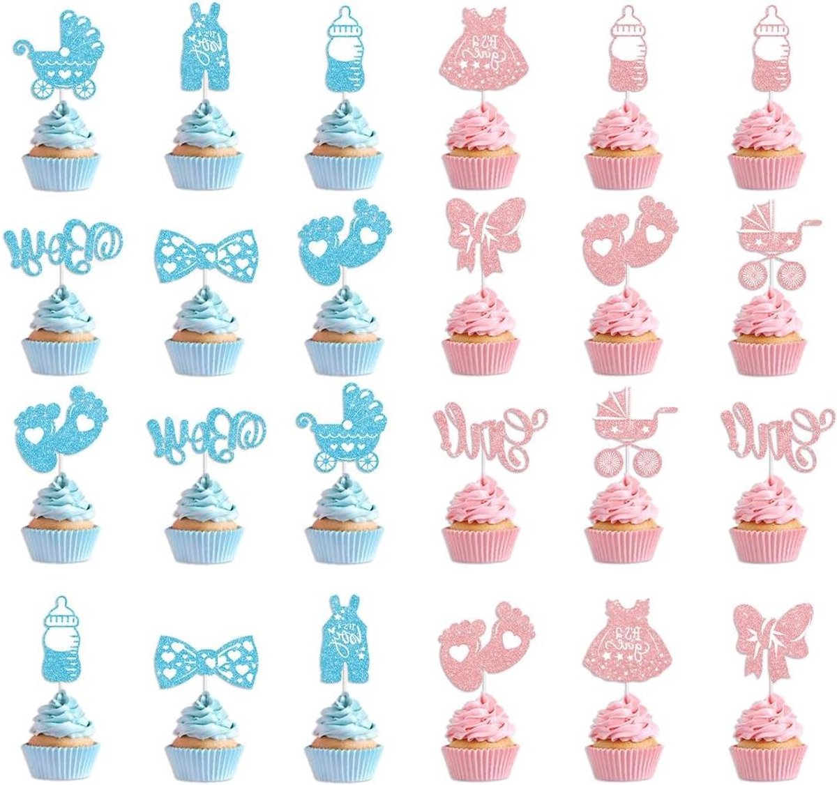 Feestelijke taarttoppers – Genderreveal – Voor jongens meisjes – Babyshower – Bruiloft geboorte verjaardag – Roze blauw – Taartdecoratie – Geslacht openbaring – 24 stuks.