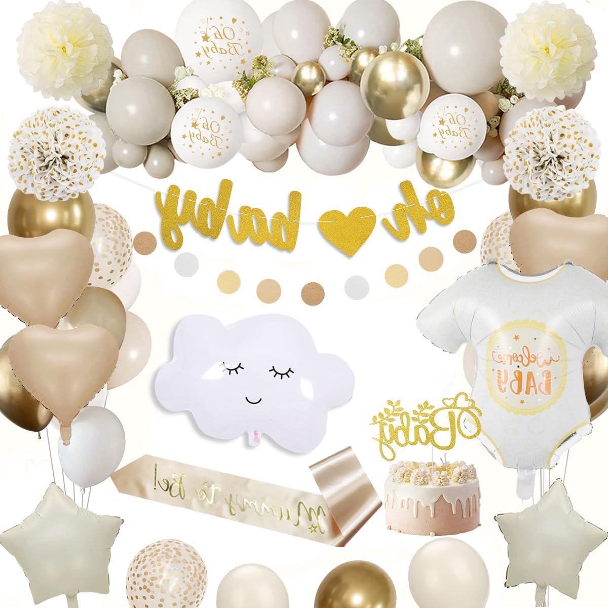 Babyshower decoraties: met zandwitte ballonnen, witte metallic ballonnen, witte ballonnen, gouden ballonnen, gouden taarttoppers en banners, perfect voor babyshowerdecoraties, ongeacht of het voor jongens of meisjes is.