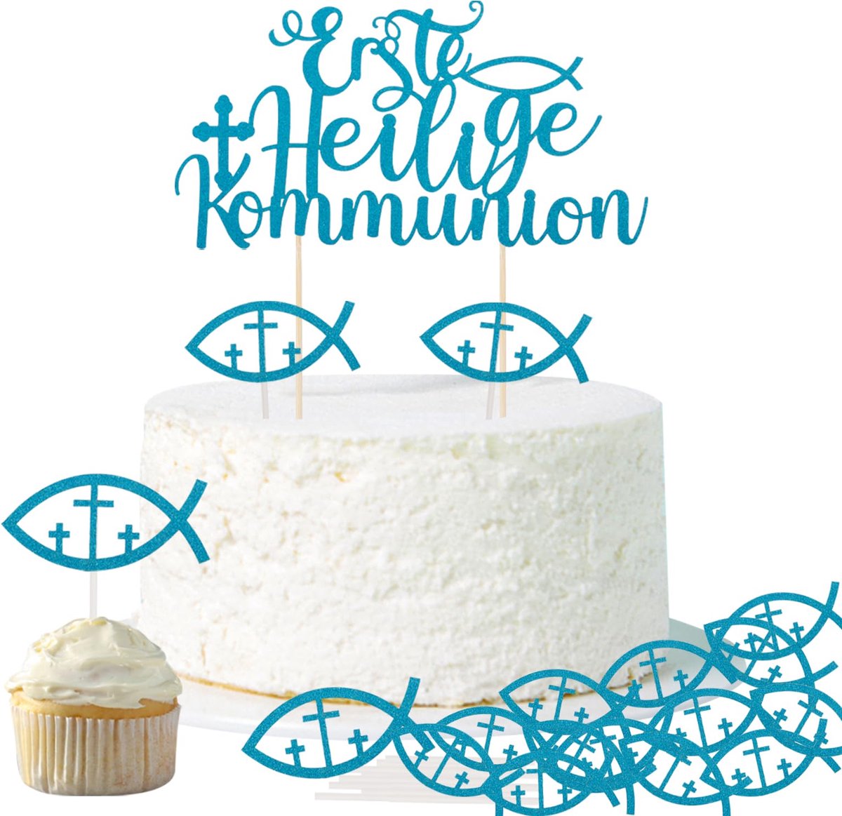 Eerste Communie Taartdecoratie voor Jongens en Meisjes, Blauw, Inclusief 1 Grote Taartmanchet en 10 Vissen, Muffin Toppers, Eerste Communie Taartdecoratie