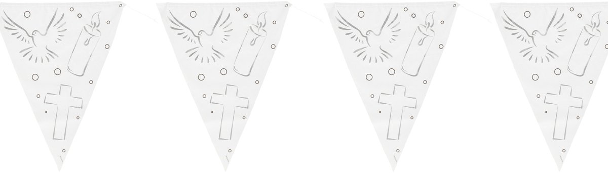 2 stuks communie vlaggenlijn van Folat. Maak van de eerste communie een onvergetelijke dag met deze stijlvolle witte vlaggenlijn! De neutrale kleur en het zachte design passen perfect bij de feestelijke en respectvolle sfeer van een communieviering. Met een lengte van 10 meter is de slinger ideaal om een ruimte te versieren – zowel binnen als buiten. Gemaakt van stevig plastic, dus weerbestendig en herbruikbaar.