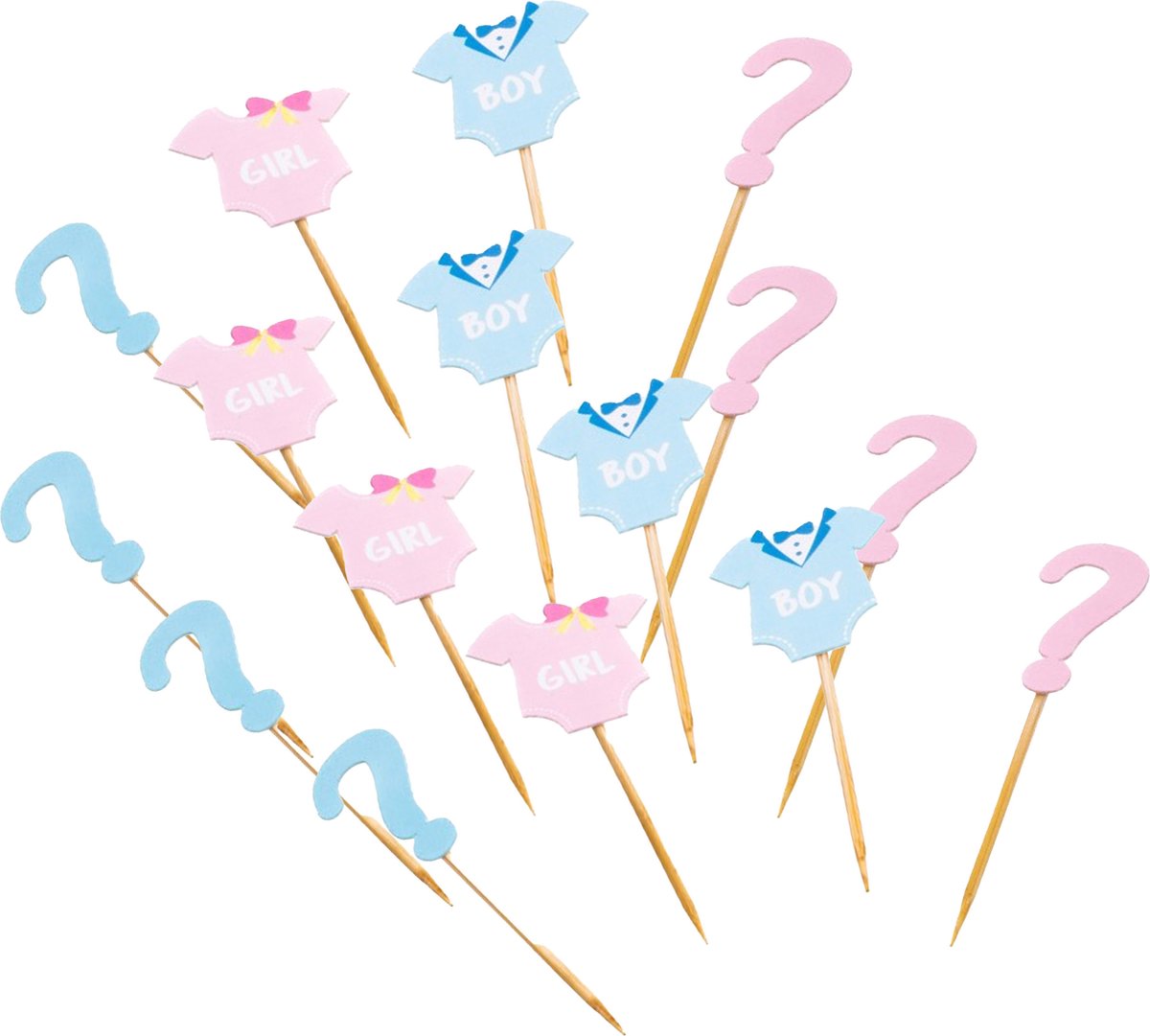 24x Baby Gender Reveal cup cake prikker. Versier je gender reveal cupcakes met deze leuke cupcake prikkers in roze en blauw! Ideaal voor het thema van jouw babyshower of gender reveal-feest. De prikkers zijn voorzien van het opschrift Team Boy en Team Girl, zodat iedere gast zijn voorkeur kan laten zien. Voeg direct een feestelijke en persoonlijke touch toe aan de traktaties! Maak je baby gender reveal-feest compleet met deze schattige cupcake prikkers, de perfecte, feestelijke toevoeging voor iedere Gender Reveal en babyshower! Afmeting prikker: ca. 9 cm.