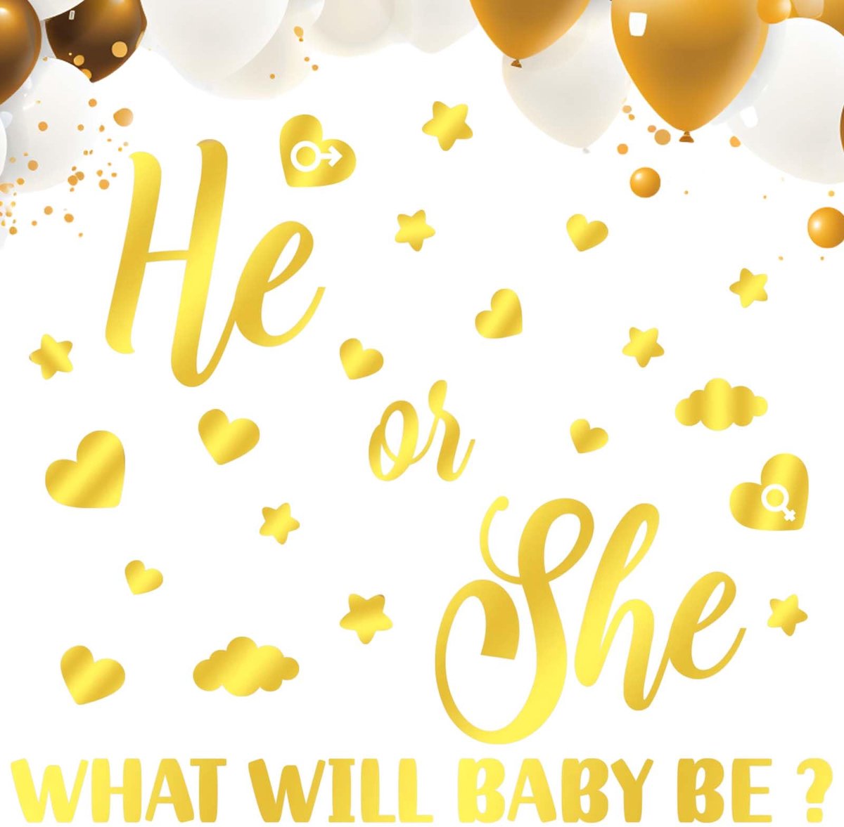 He or She Gender Reveal Decorations, Gold Gender Reveal Stickers Self Adhesive Gender Reveal Background Baby Shower Party Sticker Board for Party Background Decoration
