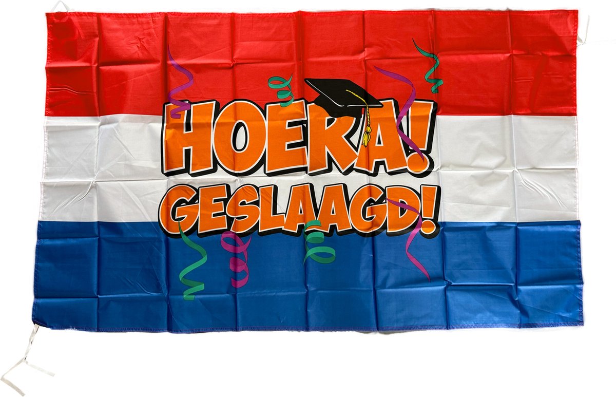 Rood, wit, blauw vlag met opdruk Hoera! Geslaagd!