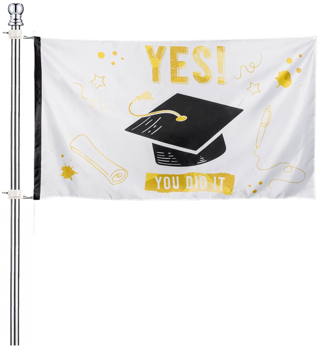 Geslaagd/afgestudeerd vlag met een afstudeerhoed en de tekst ‘Yes! You did it’ design om een tas aan op te hangen zodra iemand afgestudeerd is. De polyester vlag is 90 x 150 cm en te bevestigen aan een vlaggenstok. Zo weet iedereen dat iemand geslaagd is. Ook ideaal als examenfeest of diploma uitreiking versiering. Met vlaggenmast/vlaggenstok. De set word geleverd met een muurhouder, zodat je de mast gemakkelijk kunt bevestigen. Een complete set met geslaagd vlag en vlaggenstok /vlaggenmast.