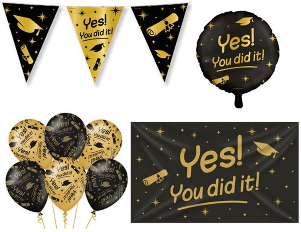 Geslaagd pakket feestversiering Geslaagd goud-zwart – Classy party 4 delig.