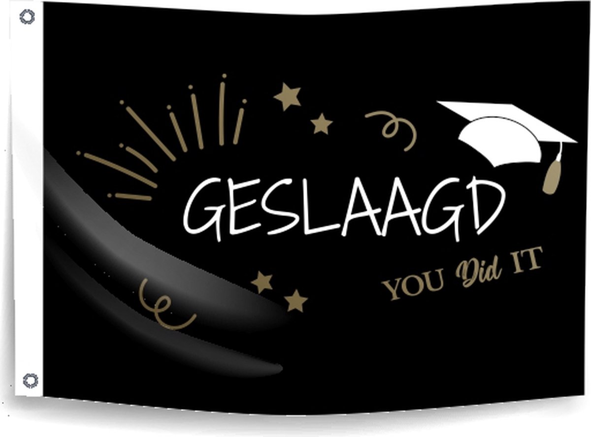 Wil je je trots en vreugde laten zien met een geslaagd vlag? Zoek niet verder! Onze prachtige geslaagd vlag, met de elegante kleuren goud en wit, is de perfecte manier om je prestaties te vieren. Met afmetingen van 90 x 150 centimeter valt deze vlag lekker op. De geslaagd vlag is gemaakt van hoogwaardig polyester voor duurzaamheid en langdurig gebruik. Deze vlag is vakkundig geproduceerd met hoogwaardige en duurzame materialen, zodat deze lang mooi blijft, zelfs bij blootstelling aan verschillende weersomstandigheden. Of het nu op het balkon, in de tuin of op de vlaggenmast is, deze vlag zal altijd in het oog springen en is makkelijk op te hangen met behulp van de 2 ringen. Bevestig deze bijvoorbeeld aan een vlaggenmast door het touw door de ringen te halen en stevig te bevestigen. Laat in stijl zien dat je geslaagd bent met onze geslaagd vlag!