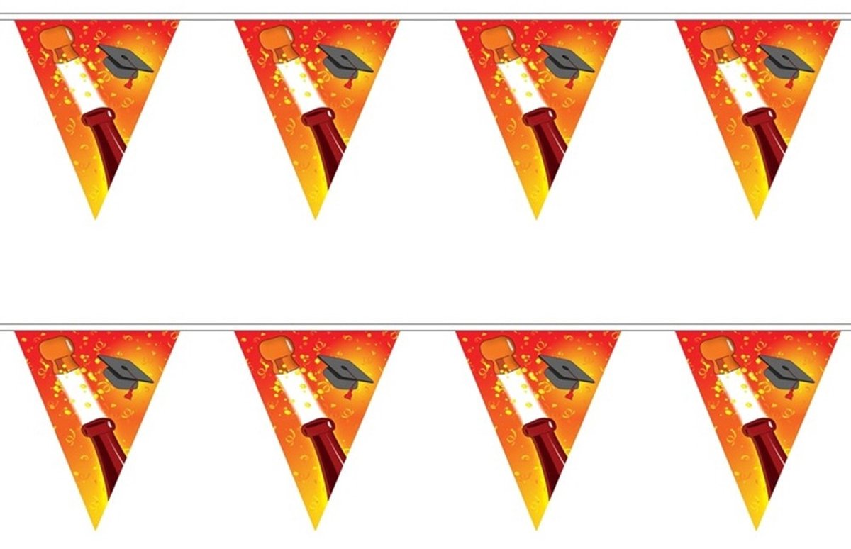 2x geslaagd/afgestudeerd vlaggenlijn/slinger champagne 5 m. Afgestudeerd/geslaagd? Versier je huis met deze slinger. Rood/gele vlaggenlijn met print van een doctoraal hoedje en champagnefles. Materiaal: plastic/kunststof. Formaat: 5 meter, met 10 vlaggen. Geslaagd feestartikelen versiering.