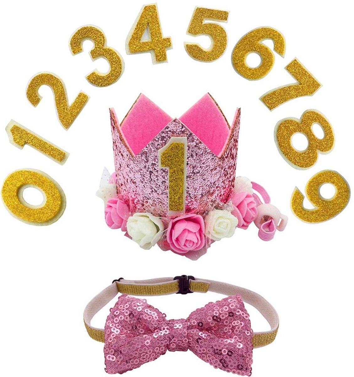 – zelfklevende gouden glitter letters van 0-8. Deze letters zijn makkelijk op het hoedje te plakken en weer te verwijderen. Daardoor is deze set voor meerdere verjaardagen te gebruiken. Je kan zo een leuke serie maken van de opeenvolgende verjaardagen