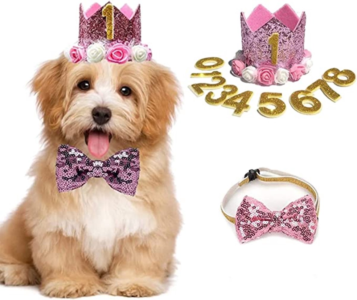 11-delige honden verjaardags set met hoedje met cijfers en strik roze – hond – huisdier – honden verjaardag – hoed – strik – roze