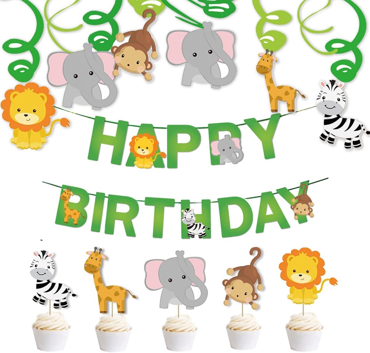 Leuke dierenmotieven: De decoraties bevatten schattige dieren zoals olifanten, zebra’s, leeuwen, giraffen en apen, perfect voor een dierenfeest of een ander speciaal evenement.