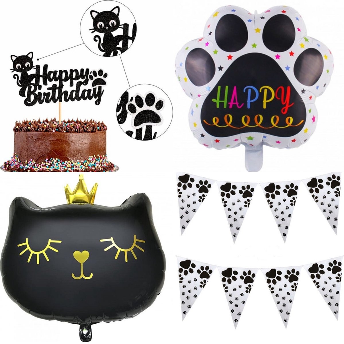Poezen verjaardags pakket zwart/wit 4-delig – poes – kat – verjaardag – birthday – decoratie – huisdier – taarttopper – ballon – slinger