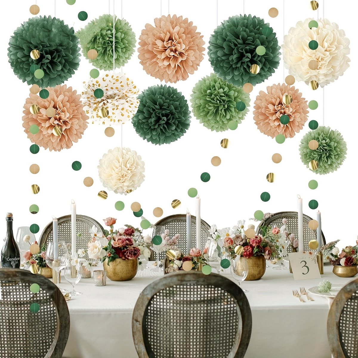 15 stuks/1set Groen verjaardag partij decoratie papier bloem bal ,papier string pull bloem ballon, bruiloftsfeest papier bloembal decoratie set, groene weefsel pompons, punten , ideaal voor verloving, bruiloft,verjaardagsfeest, Hoogwaardige Papierd