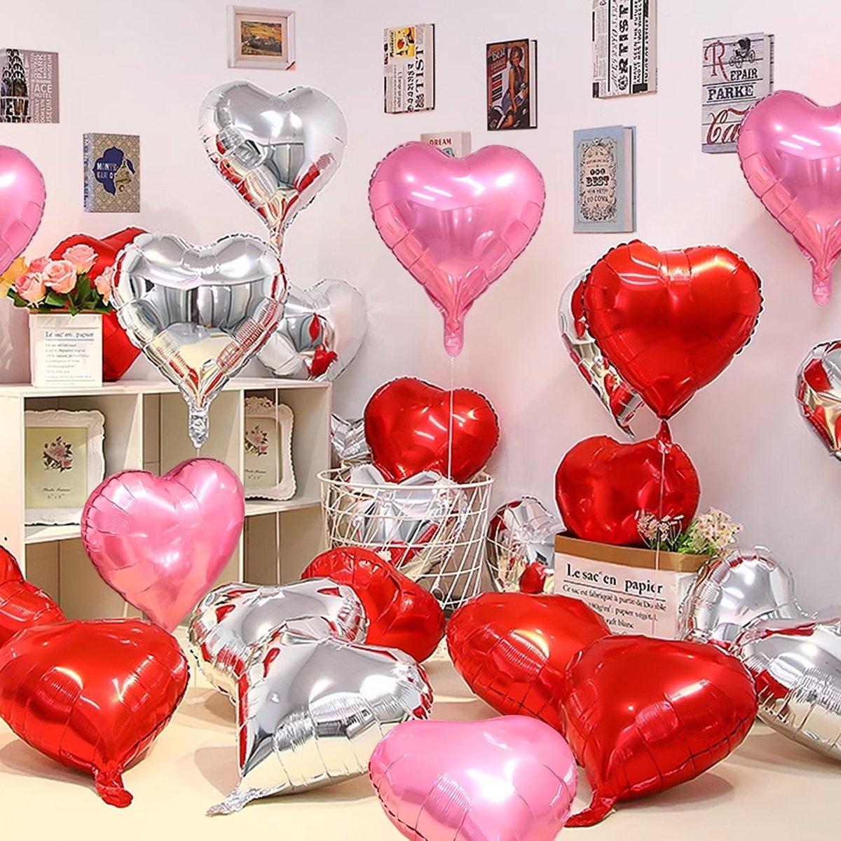 Vorm en Kleur: De set bevat 60 hartvormige ballonnen in drie verschillende kleuren: 20 rode, 20 roze en 20 zilveren. Met een diameter van 25 cm zijn ze perfect voor elke versiering.