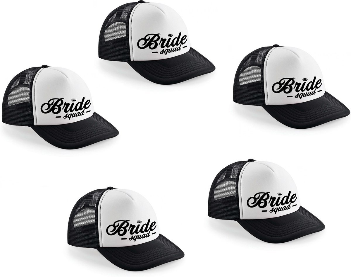 6x stuks zwart Bride Squad snapback cap/ truckers pet dames – Vrijgezellenfeest petjes. Ga herkenbaar verkleed op een vrijgezellenfeest met deze stoere snapback cap! Dit petje is bedrukt met Bride Squad. Materiaal: voorkant 100% gevoerd polyester/ achterkant 100% polyester mesh. De cap heeft een plastic verstelbare druksluiting.