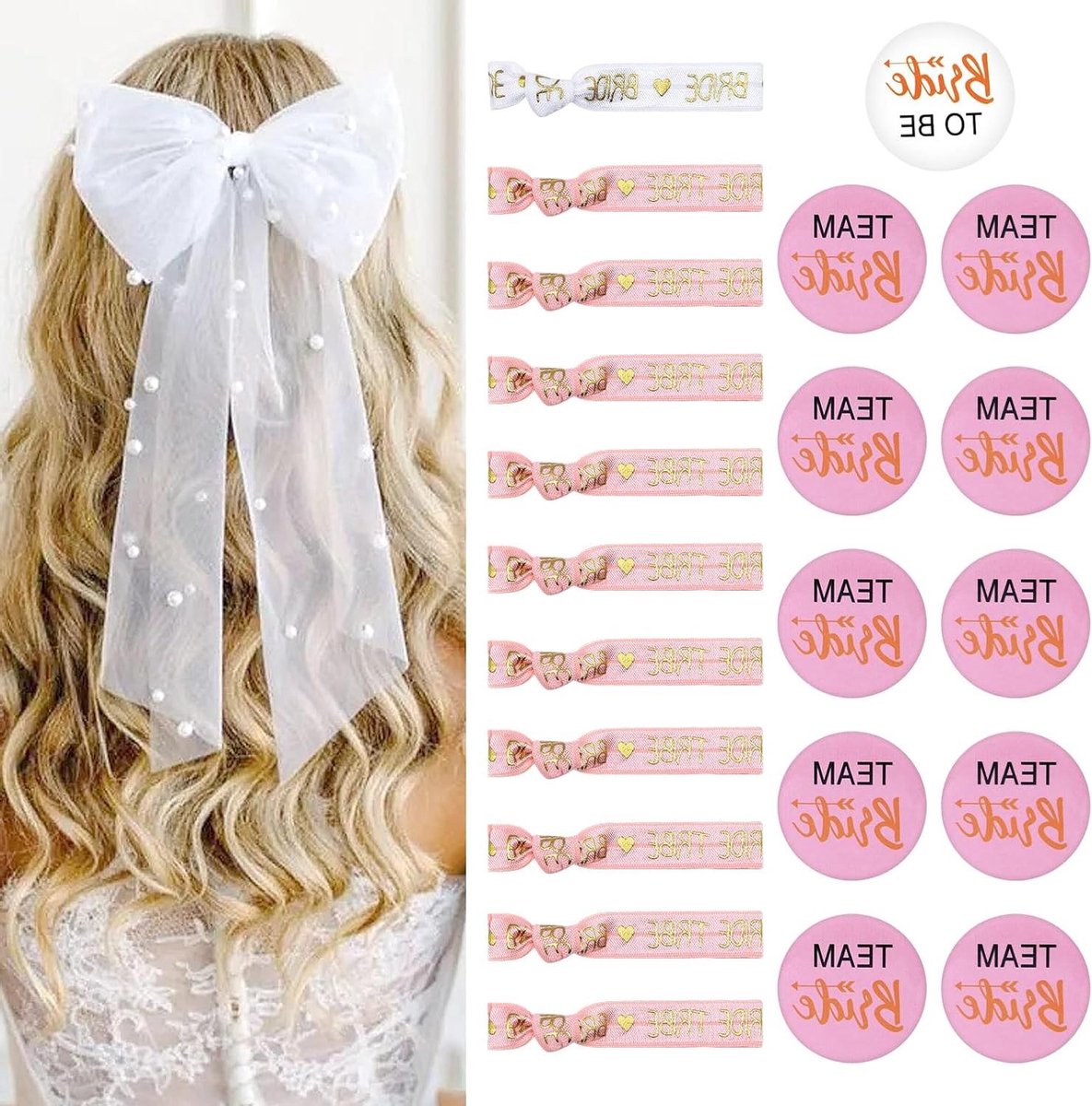 All4You – Accessoires voor vrijgezellenfeest vrouwen – Bride to be strik set – Armbanden – Badge en button team bride – Bruiloft en vrijgezellenfeest.