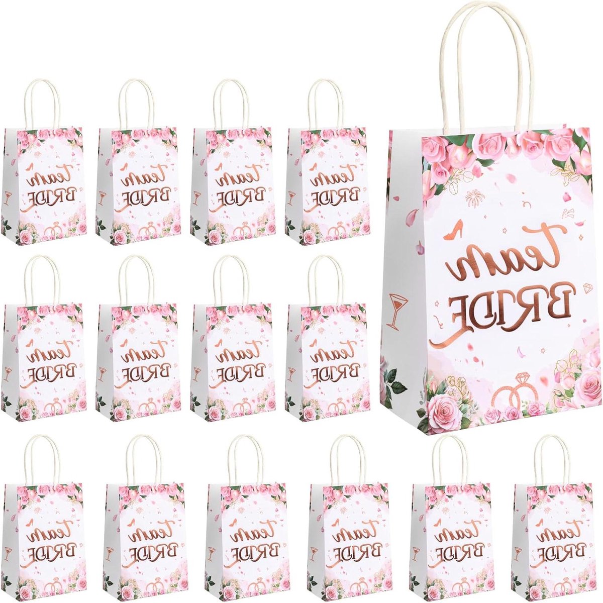 “`html Perfect voor vrijgezellenfeest Feesttassen voor vrijgezellenfeesten zijn roségouden kleur en bloemenelementontwerp, verijdeld met “Team Bride” letters, geschikt voor vrijgezellenfeest, vrijgezellenfeest, bruidsdouche thema.