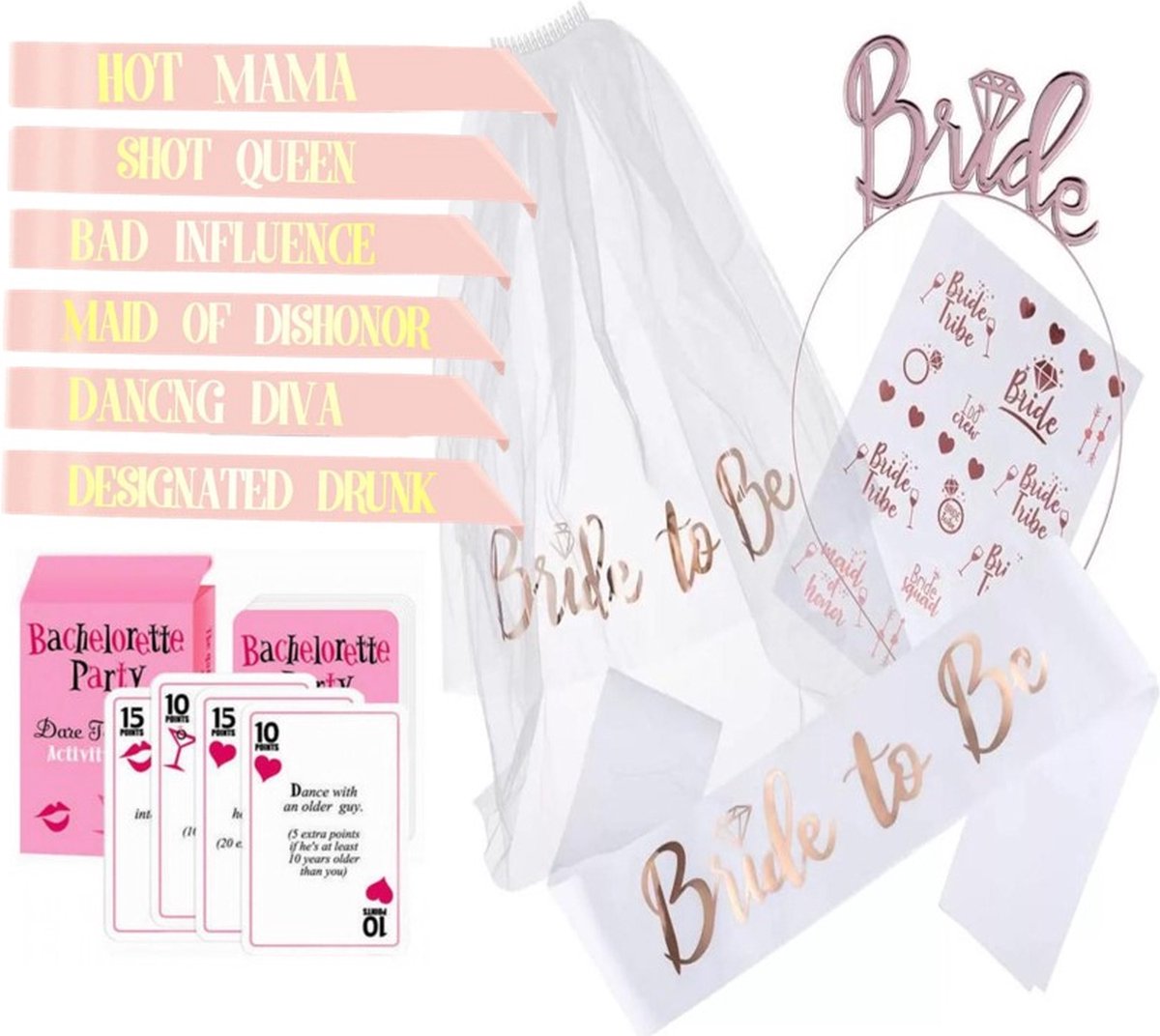 1x Sluier voor de bruid: Deze mooie sluier voegt een vleugje elegantie toe aan de bruid. Het is een klassiek accessoire dat perfect is voor een vrijgezellenfeest.