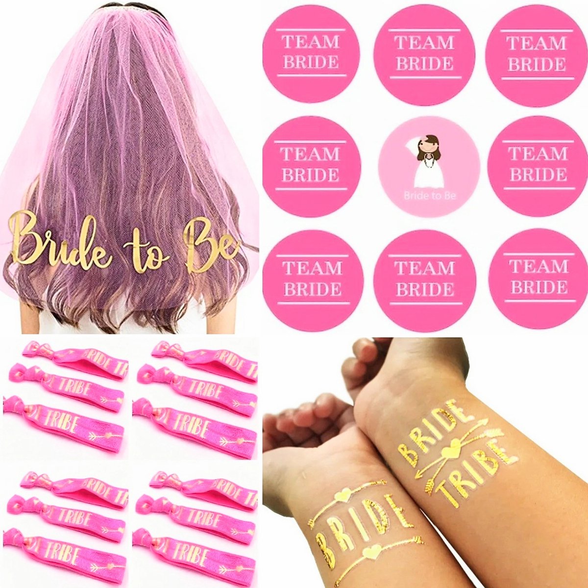 Vrijgezellenfeest set Hot Pink 28-delig met sluier, buttons, armbanden en tatoeages – vrijgezellenfeest – bride to be – team bride – trouwen – huwelijk
