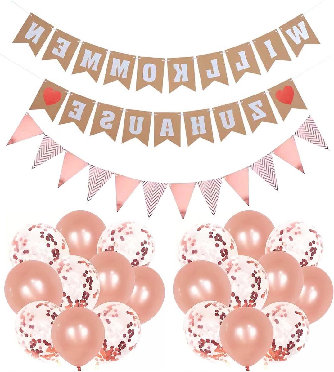 Thuis Welkomstset Uitgebreide Thuis Welkomstset Deze welkom thuis decoratieset bevat een set banner gemaakt van kraftpapier, een roségouden driehoekige gestreepte banner met folie en 30 roségouden ballonnen (20 stuks 12-inch parelmoer ballonnen en 10 stuks roségouden glitterballonnen).