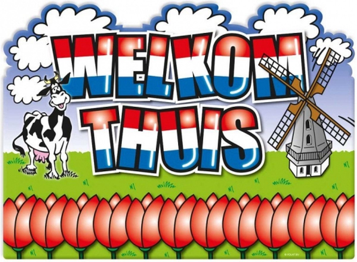 Typisch Hollandse deurbord, welkom thuis. Welkom thuis in echte Hollandse stijl met dit typisch Hollandse deurbord! Dit vrolijke bord is gemaakt van stevig karton en is versierd met een herkenbaar Nederlands design. Ideaal om een warme en feestelijke sfeer te creëren bij thuiskomst of als decoratie tijdens een feestje. Met een formaat van ongeveer 47,5 x 35 x 0,2 cm is dit deurbord groot genoeg om direct op te vallen, maar licht en gemakkelijk op te hangen. Perfect voor themafeesten, verhuismomenten of om vrienden en familie een hartelijk welkom te heten.