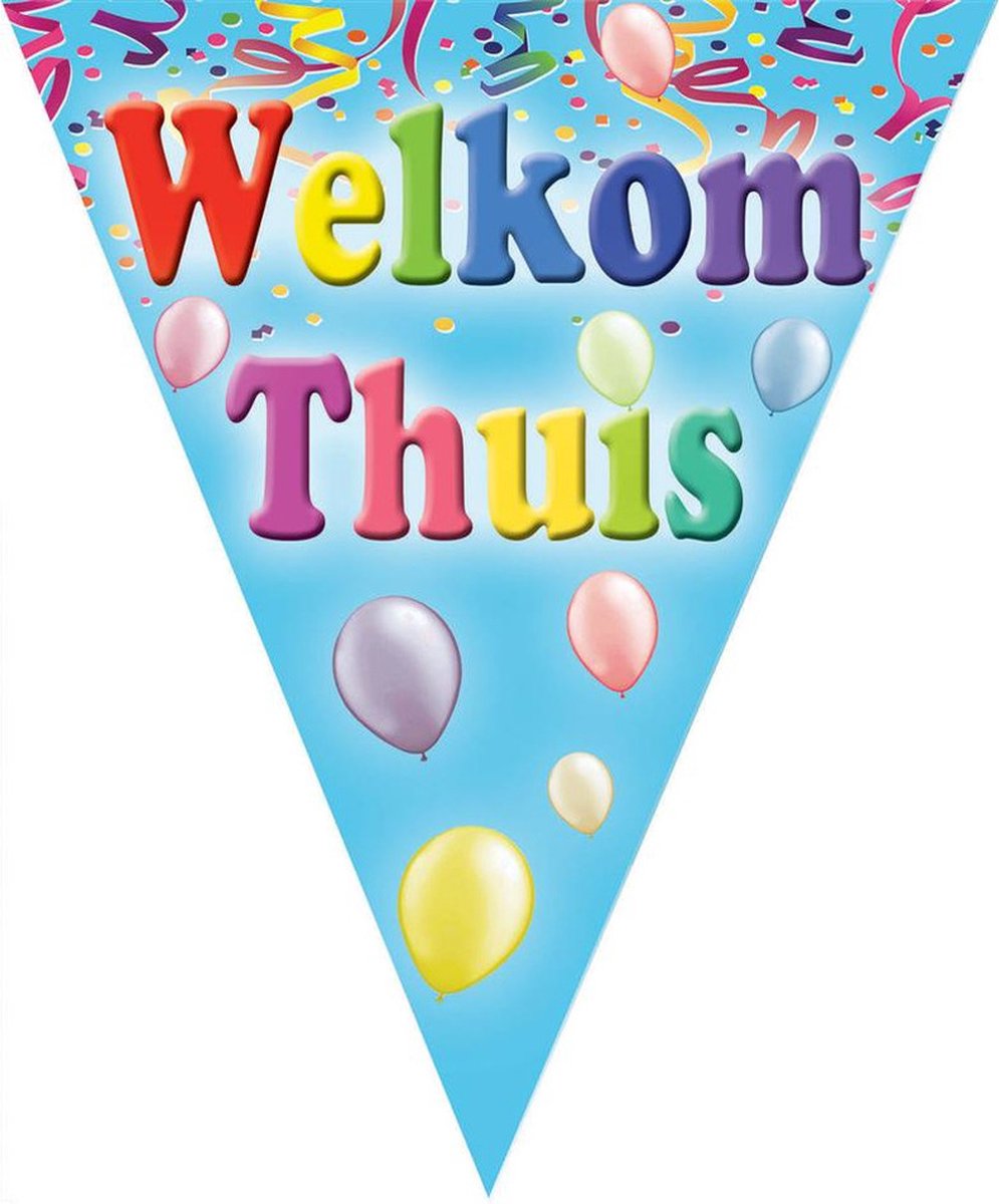 Welkom thuis vlaggen slinger. Geef een warm welkom met deze vrolijke blauwe “Welkom Thuis” vlaggenlijn! Met zijn lengte van 5 meter en 10 puntvlaggetjes is deze slinger perfect om een kamer, tuin of oprit feestelijk te versieren. Ideaal voor het thuiskomen van een geliefde na een lange reis, een ziekenhuisopname of gewoon omdat iemand het verdient om extra in het zonnetje gezet te worden. De vlaggenlijn is gemaakt van kunststof en kan dus zowel binnen als buiten gebruikt worden.