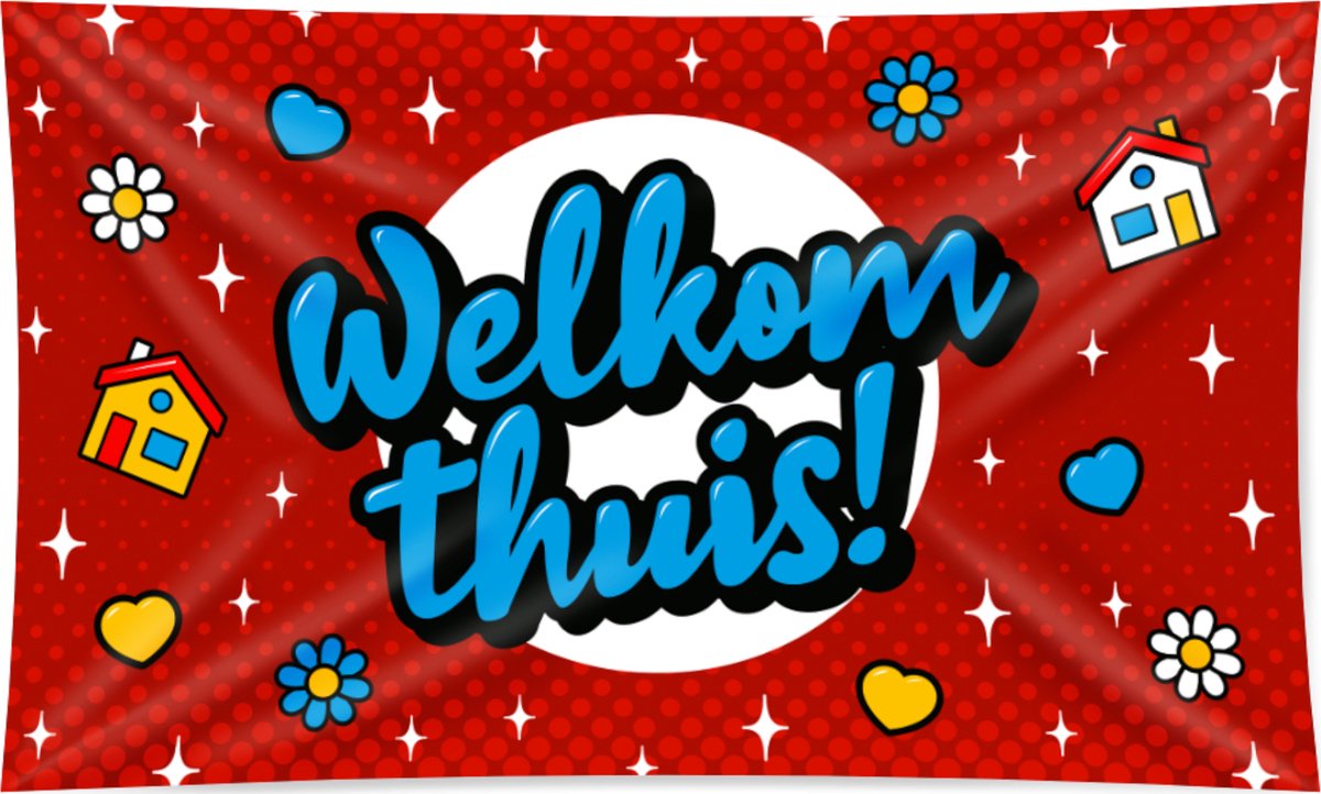 XXL Gevel vlag – Welkom thuis cartoon Breng warmte en een vrolijke sfeer in je huis met de XXL gevel vlag – Welkom thuis cartoon. Deze prachtige vlag is perfect om je gasten een warm welkom te geven. Maak van je entree een feestelijke aangelegenheid met deze kleurrijke en opvallende vlag die iedereen zal opvallen.