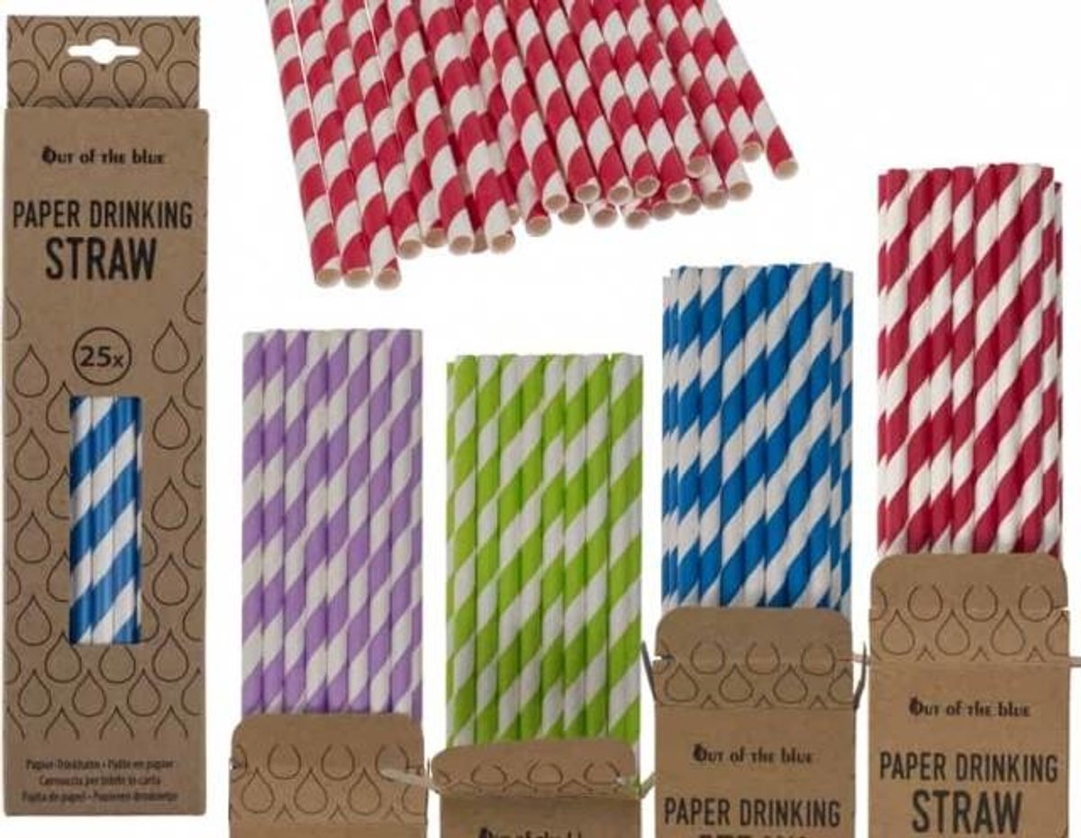 Met de papieren rietjes van Out of the Blue geniet je van je drankje op een milieuvriendelijke manier. De rietjes zijn stevig, vrolijk gekleurd en verpakt in een handig doosje. · Merk: Out of the Blue· Aantal: 25 stuks per doosje· Materiaal: papier· Lengte: standaard drinkrietjesformaat· Levering: willekeurige kleur of uitvoering Deze duurzame rietjes zijn een goed alternatief voor plastic varianten en maken elk drankje direct wat gezelliger. Doordat ze in verschillende kleuren geleverd worden, is het steeds weer een verrassing welke je ontvangt. Perfect voor feestjes, picknicks of dagelijks gebruik thuis.