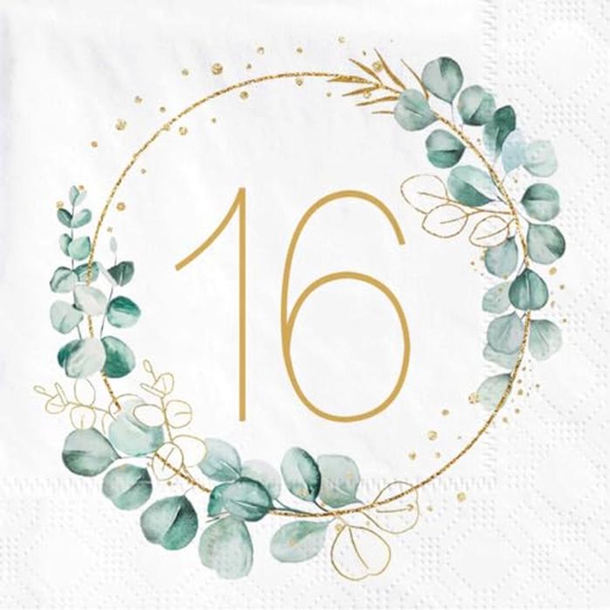 Vier een speciale 16e verjaardag met deze prachtige set van 40 papieren servetten in een stijlvol eucalyptus goud groen ontwerp. Perfect voor feestelijke tafeldecoraties bij zowel meisjes- als jongensfeesten. Deze servetten voegen een elegant accent toe aan elke feesttafel en zijn ideaal voor verjaardagsfeestjes, themafeesten of andere speciale gelegenheden. Gemaakt van hoogwaardig papier, zijn ze zowel decoratief als praktisch.