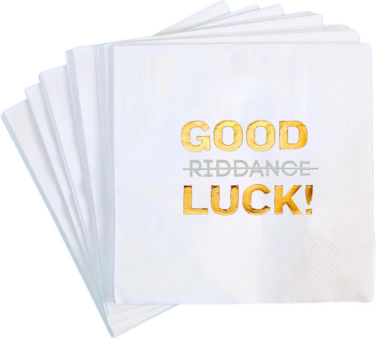Maak je feest compleet met deze unieke en grappige cocktail servetten! Dit pakket bevat 50 servetten, perfect voor elk feest, verjaardag of afscheid. De servetten zijn voorzien van de humoristische ‘Good Riddance’ (Goed Dat Je Weg Bent) tekst, wat zorgt voor een lach op ieders gezicht. Ideaal voor borrels, verjaardagen, of het vieren van een positieve verandering. Hoogwaardige kwaliteit en een perfecte toevoeging aan je tafeldecoratie.