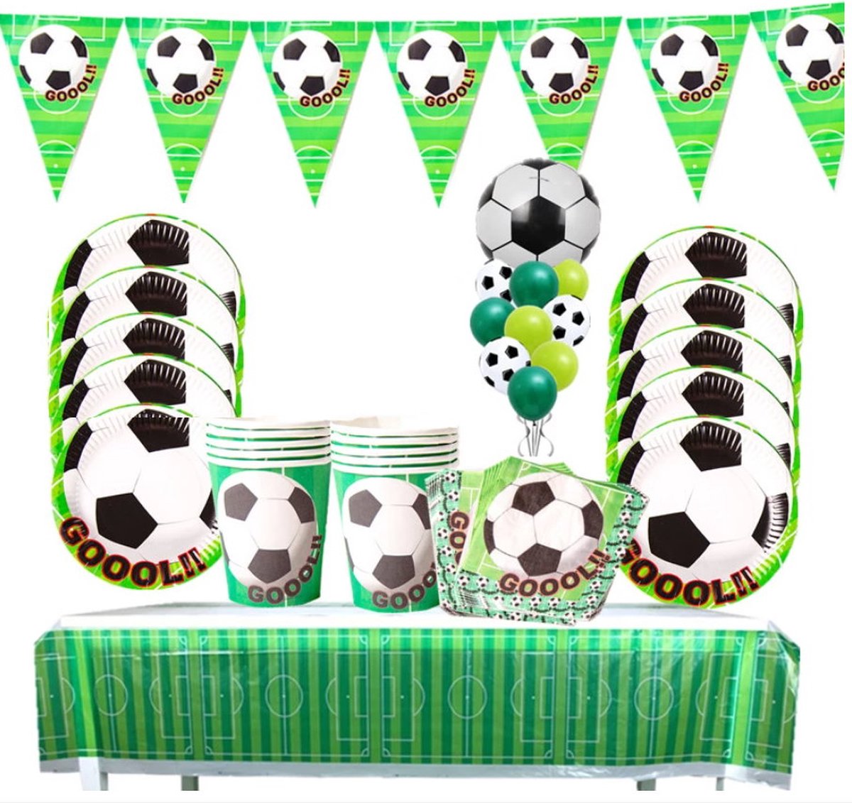 52 delige voetbal feest decoratie set – Uitdeel – Traktatie – Football – Verjaardag – Feestje – Servetten – Bekers – Bordjes – Slinger – Vlaggetjes – Tafelzeil – Goal