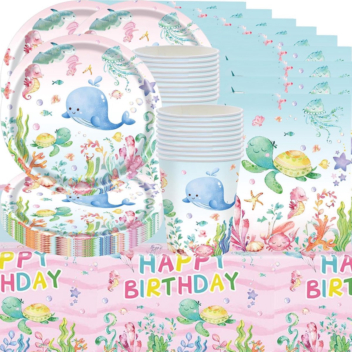 61 Stukken Onder de Zee Feest Tafelgerei – Feest Tafelgerei met Zee Motieven – Inclusief Borden, Bekers, Servetten en Tafelkleed – Geschikt voor een Feest met 20 Kinderen